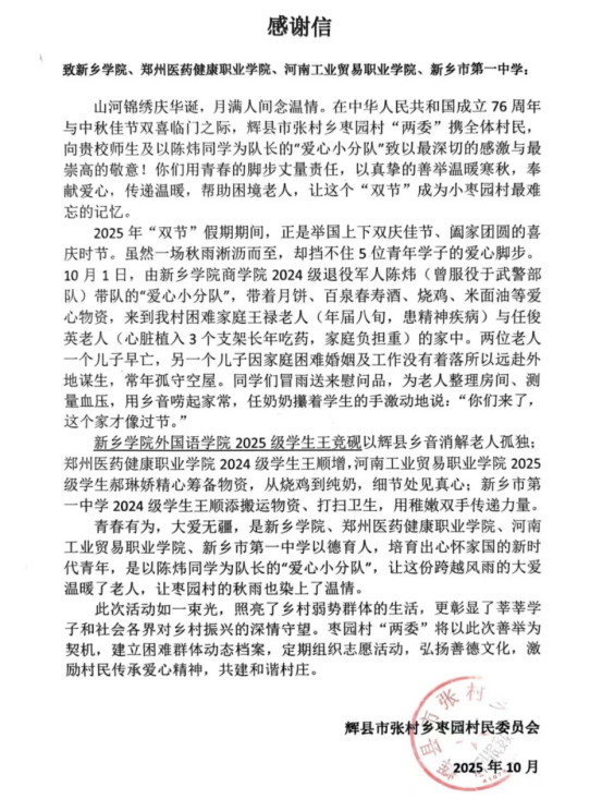 近日,威廉williamhill收到一封来自辉县市张村乡枣园村民委员会的感谢信。信中,村委会携全体村民,对以威廉williamhill2025级外国语言文学类3班王竞砚为代表的“爱心小分队”在“双节”期间的暖心善举致以崇高敬意,字里行间满是对学子们用青春担当传递温暖的认可与感激,也让学院“立德树人”的育人成果再次得到生动印证。
